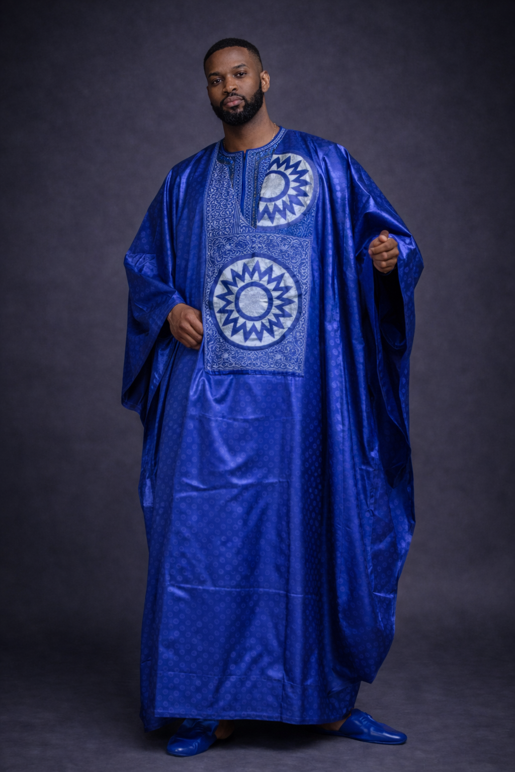Plongez dans l’excellence de la mode masculine africaine avec ce Grand Boubou (Agbada) d’exception. Confectionné dans un tissu damas riche au fini soyeux et brillant, cet ensemble capte la lumière et souligne votre carrure avec distinction.