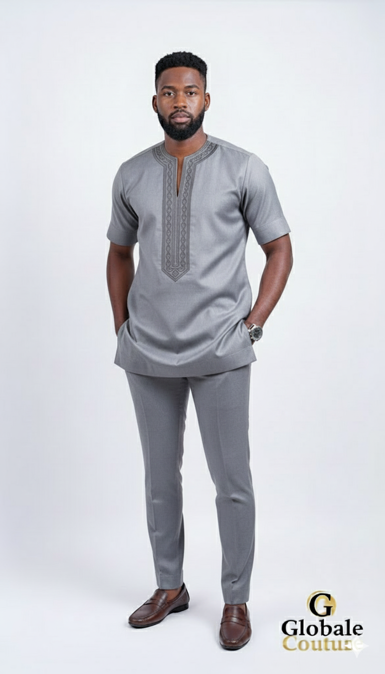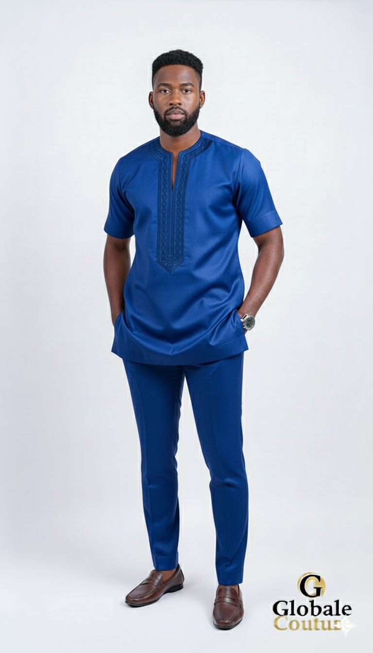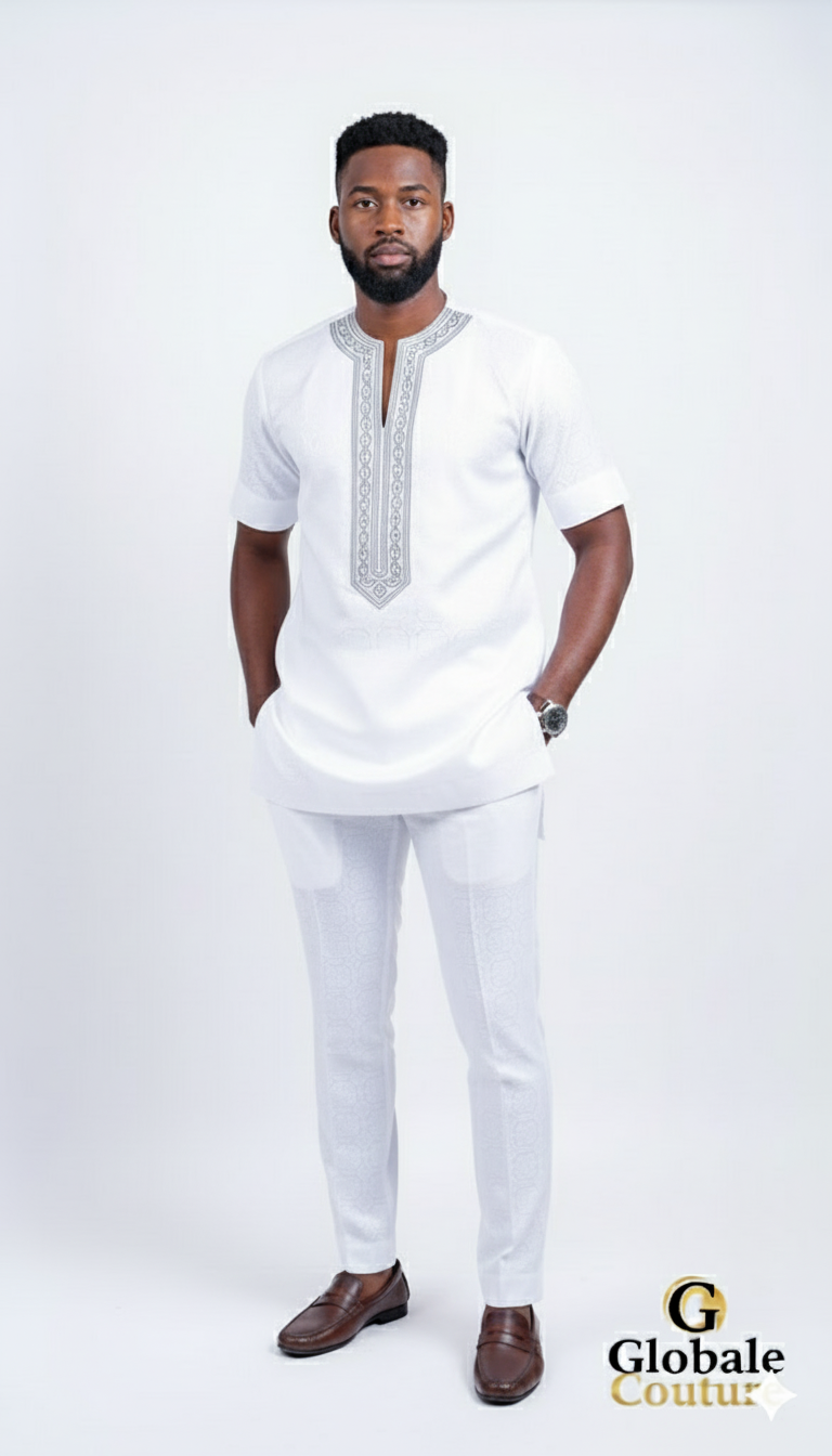 La Tunique : Une coupe cintrée à manches courtes, idéale pour une allure dynamique. Elle présente un col ouvert en « V » richement souligné par des broderies géométriques et florales ton-sur-ton et dorées, créant un plastron majestueux.