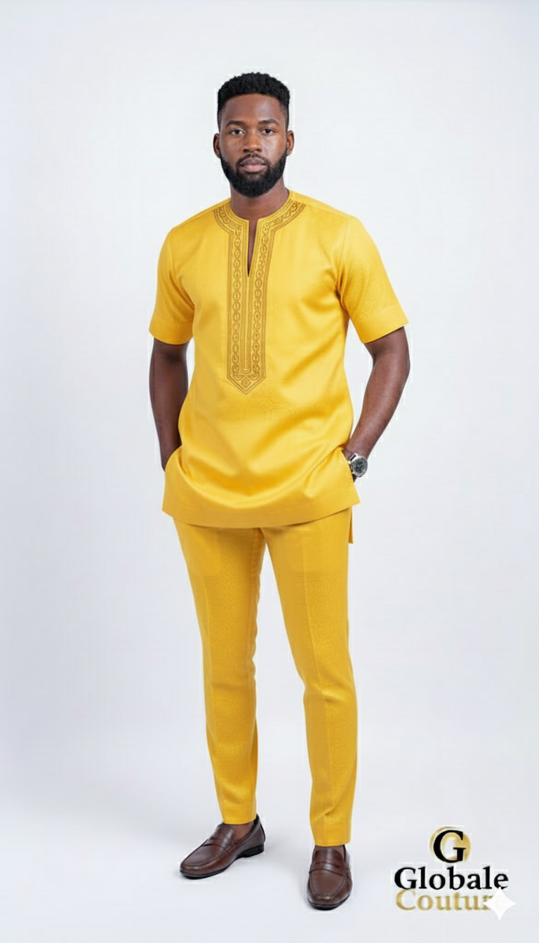 Le rayonnement de l’élégance par Globale Couture. Osez la couleur avec cet ensemble deux pièces d’un jaune safran vibrant.